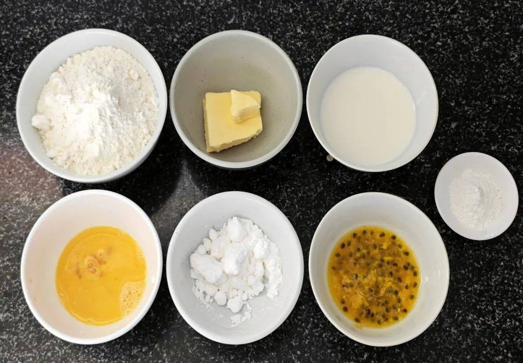 食材准备,简单到爆炸! 低筋面粉、泡打粉、白糖这些都是常见的烘焙材料,百香果汁、牛奶、鸡蛋,冰箱里应该都有吧?黄油也只需要一小块,不用提前软化,直接用就好,省时省力! 是不是感觉已经跃跃欲试了?
