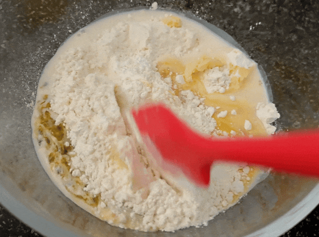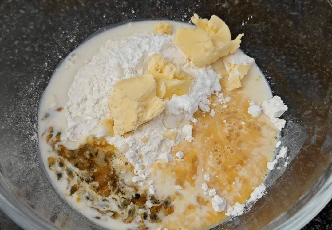 将低筋面粉、泡打粉、白糖、牛奶、全蛋液、百香果汁、黄油全部倒入大盆中。
